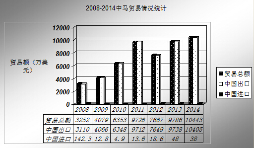 建交以来,中马两国的经济联系曾长期体现为中国向马方提供经济支援,真正意义上的经贸合作关系始于1981年,次年两国恢复了直接贸易。20043月,双方签署了贸易和经济合作协定。据统计,双边贸易额从2000年的136万美元增加至2013年的近9800万美元,增长71倍,在两国贸易中,中国一直居于贸顺差地位。